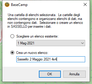 Una voltatermita l’importazione BaseCamp aprirà una finestra chiedendoci (se non abbiamo creato la Cartella o ce ne sono più di una) di confermare o scegliere un elenco già esistente: noi confermiamo
